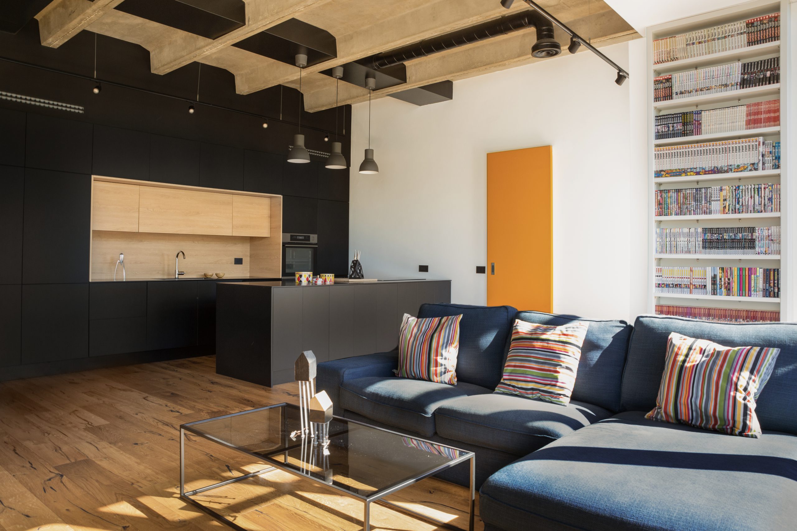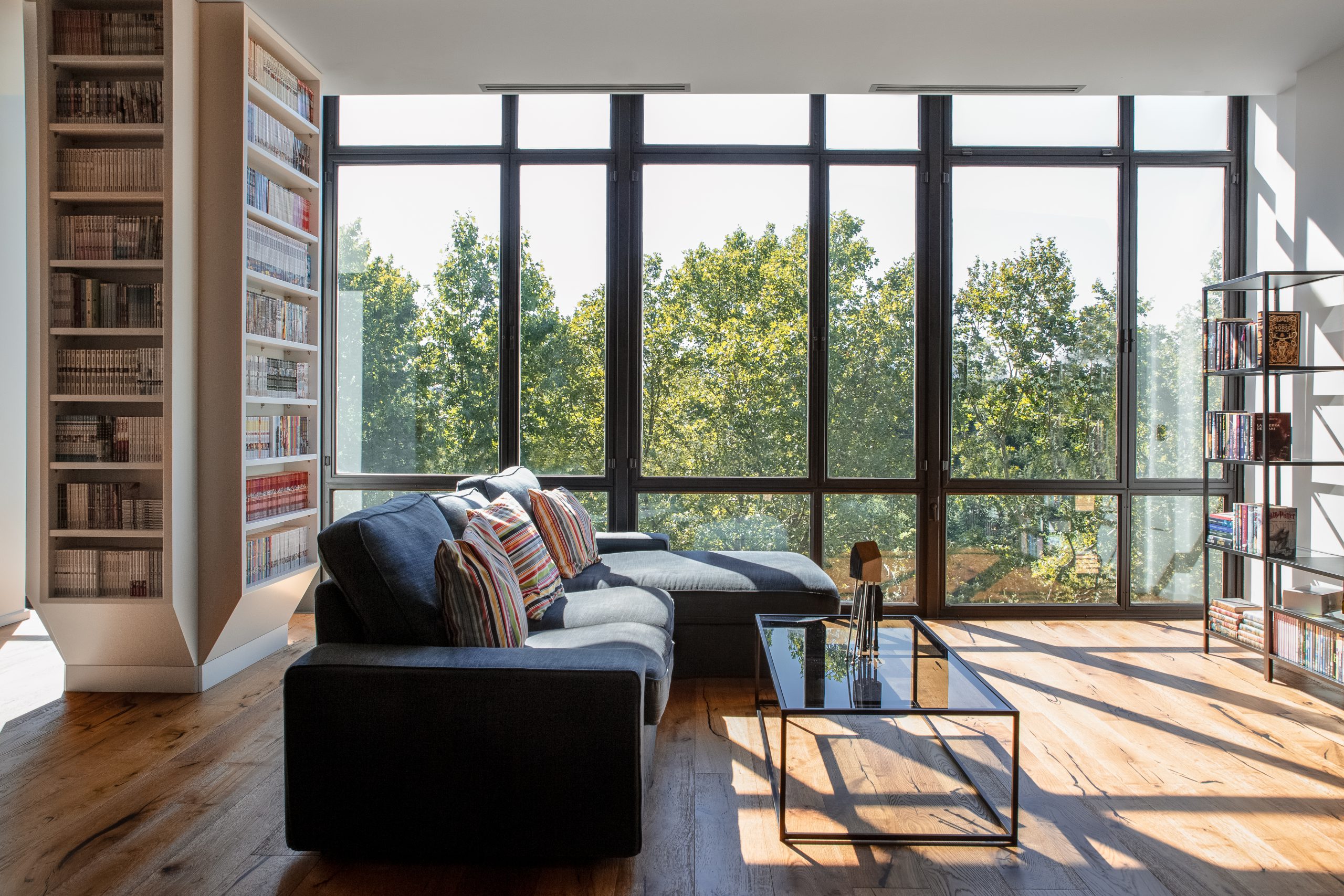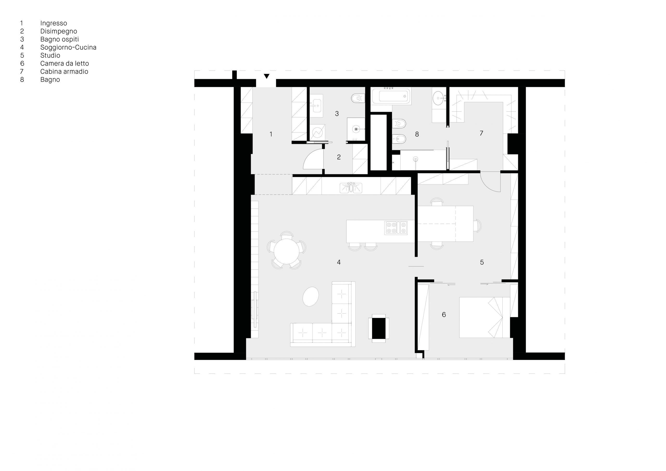 L’unità immobiliare si trova all’interno di un grande centro multifunzionale misto residenziale-terziario e l’intervento ha contemplato la conversione degli spazi, da uffici ad appartamenti. La distribuzione degli spazi, nell’impianto planimetrico quadrato, ha previsto la creazione di uno spazio di ingresso dotato di servizi e spazi tecnici/funzionali nascosti. Dall’ingresso si accede al salone e annessa cucina, illuminati dalla grande vetrata, con la disposizione degli arredi che permettono una percezione totale dell’ambiente. Il carattere contemporaneo dell’immobile ha permesso la valorizzazione della struttura in cemento armato come memoria storica. La cromia scura della cucina contribuisce al carattere contemporaneo dello spazio e l’ampia vetrata unita all’altezza del locale lasciano ampio respiro all’ambiente. La zona notte è composta da tutti gli elementi utili per la divisione degli spazi con la zona giorno. Una zona studio completa la ristrutturazione permettendo di fruire gli ambienti in tutte le ore del giorno.