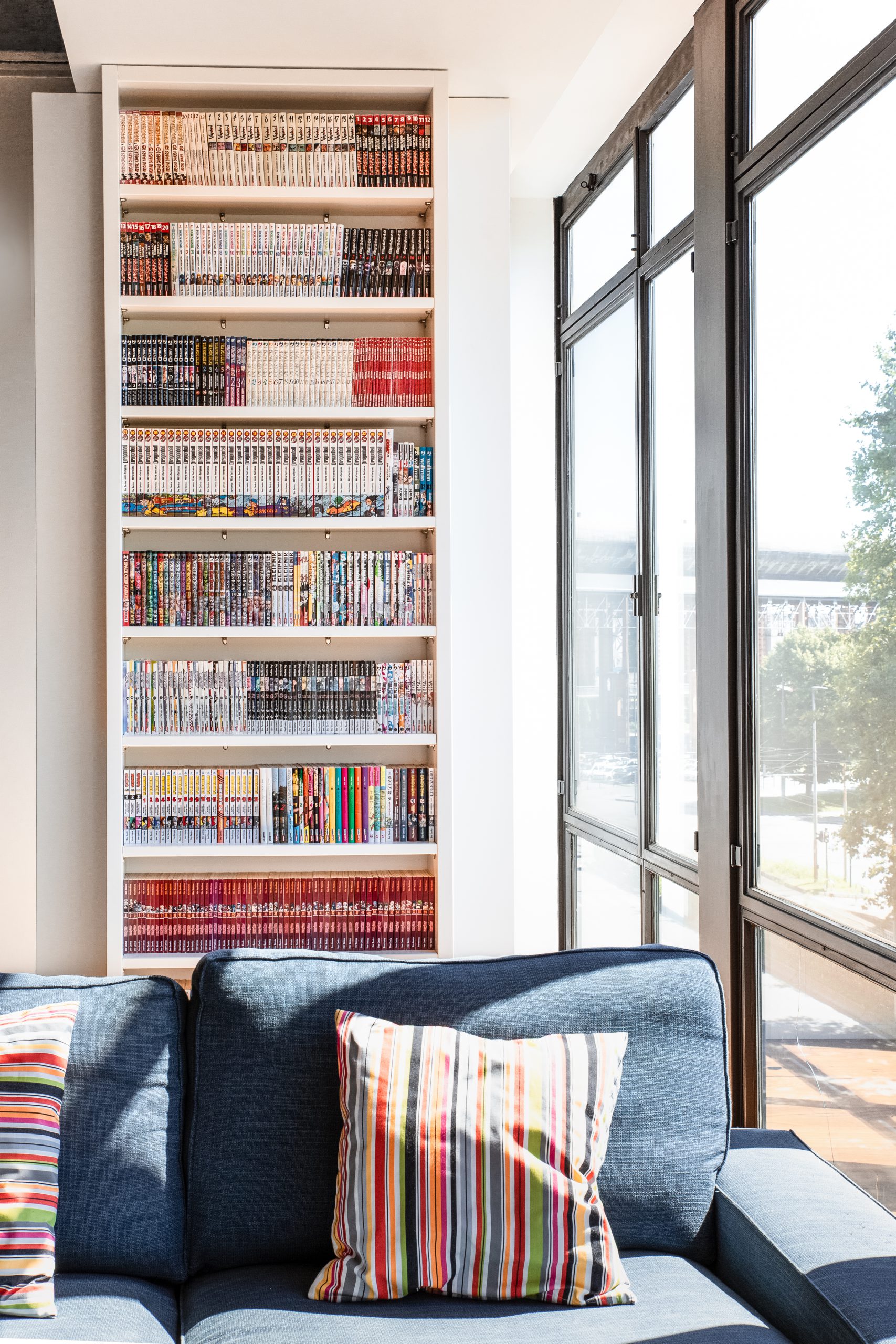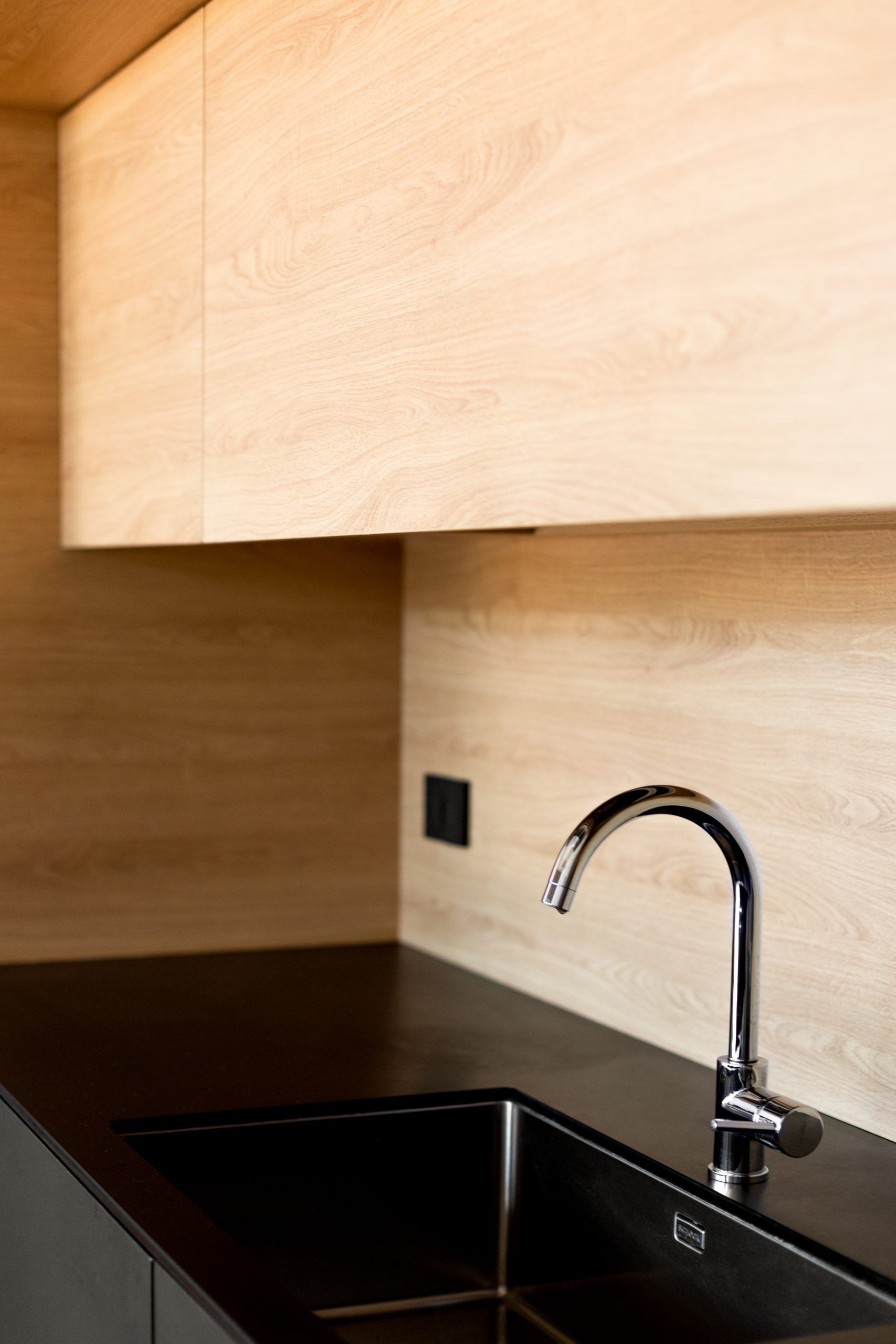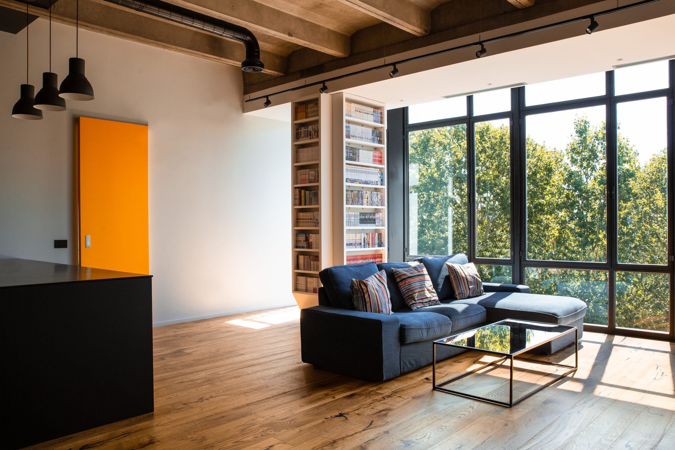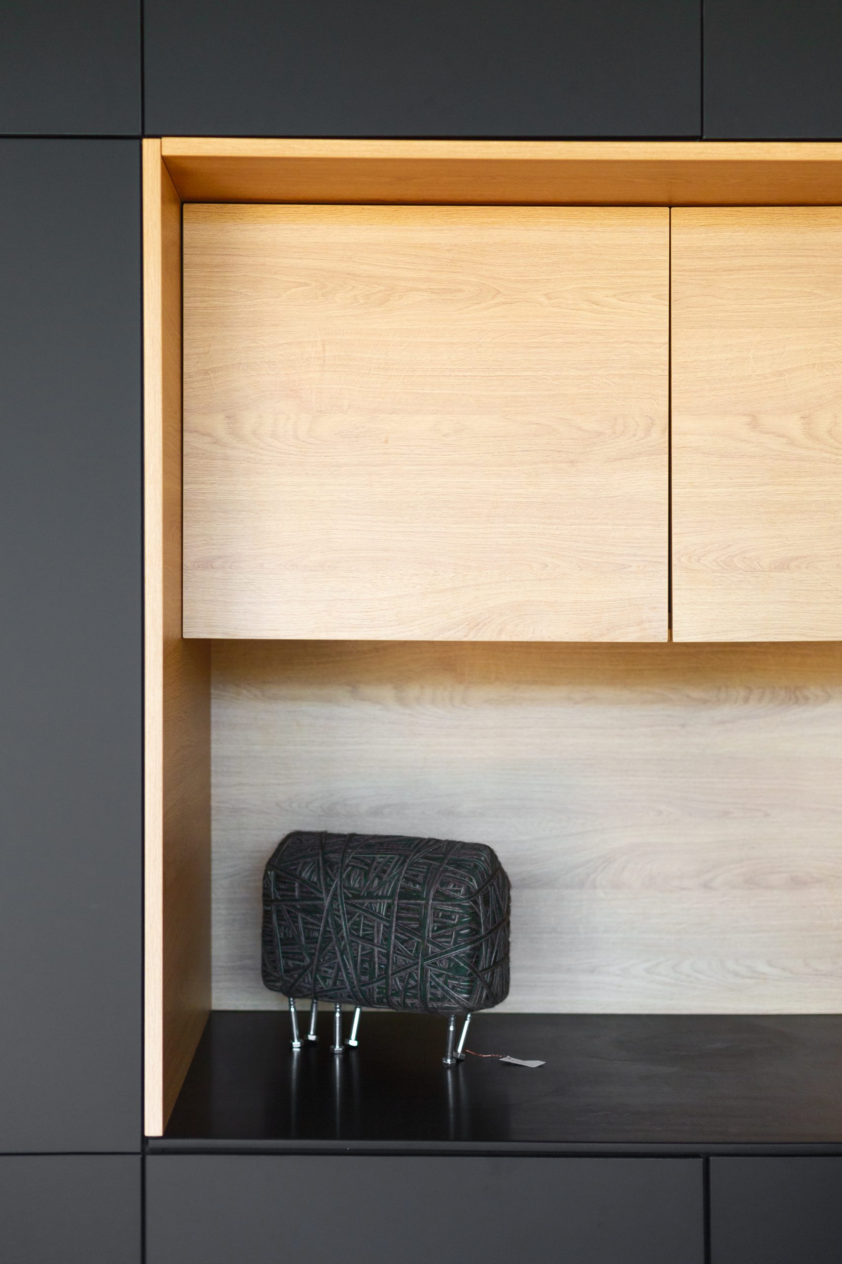 L’unità immobiliare si trova all’interno di un grande centro multifunzionale misto residenziale-terziario e l’intervento ha contemplato la conversione degli spazi, da uffici ad appartamenti. La distribuzione degli spazi, nell’impianto planimetrico quadrato, ha previsto la creazione di uno spazio di ingresso dotato di servizi e spazi tecnici/funzionali nascosti. Dall’ingresso si accede al salone e annessa cucina, illuminati dalla grande vetrata, con la disposizione degli arredi che permettono una percezione totale dell’ambiente. Il carattere contemporaneo dell’immobile ha permesso la valorizzazione della struttura in cemento armato come memoria storica. La cromia scura della cucina contribuisce al carattere contemporaneo dello spazio e l’ampia vetrata unita all’altezza del locale lasciano ampio respiro all’ambiente. La zona notte è composta da tutti gli elementi utili per la divisione degli spazi con la zona giorno. Una zona studio completa la ristrutturazione permettendo di fruire gli ambienti in tutte le ore del giorno.