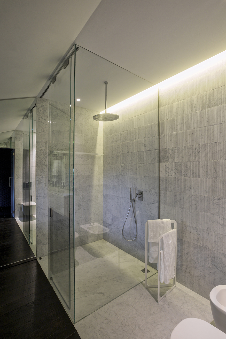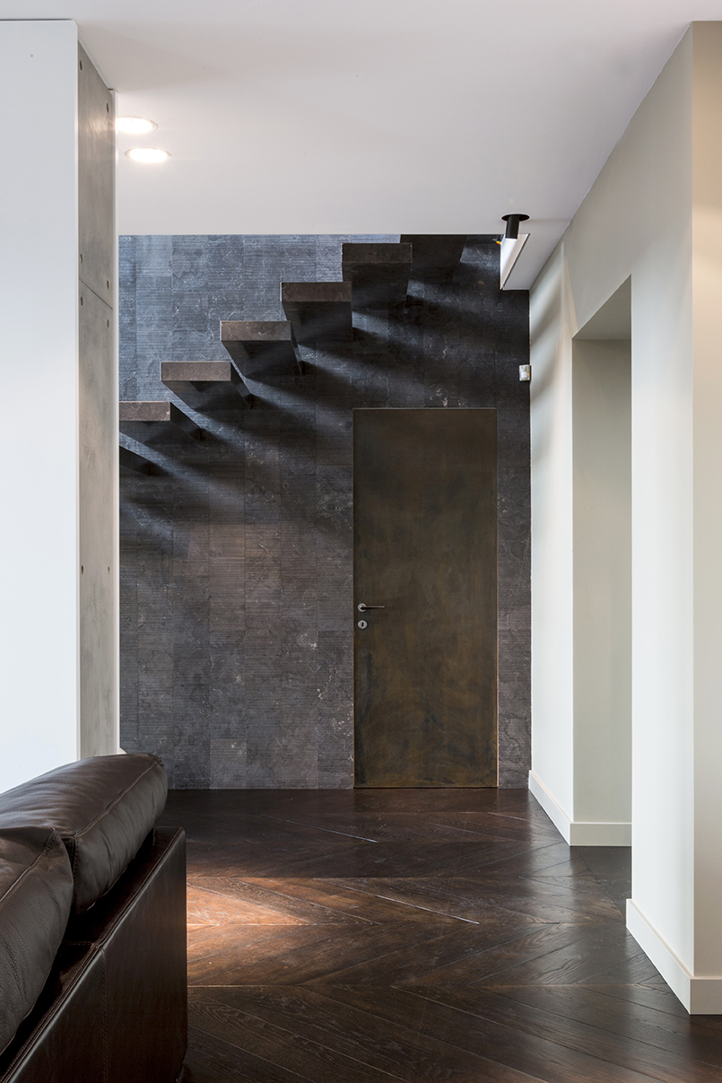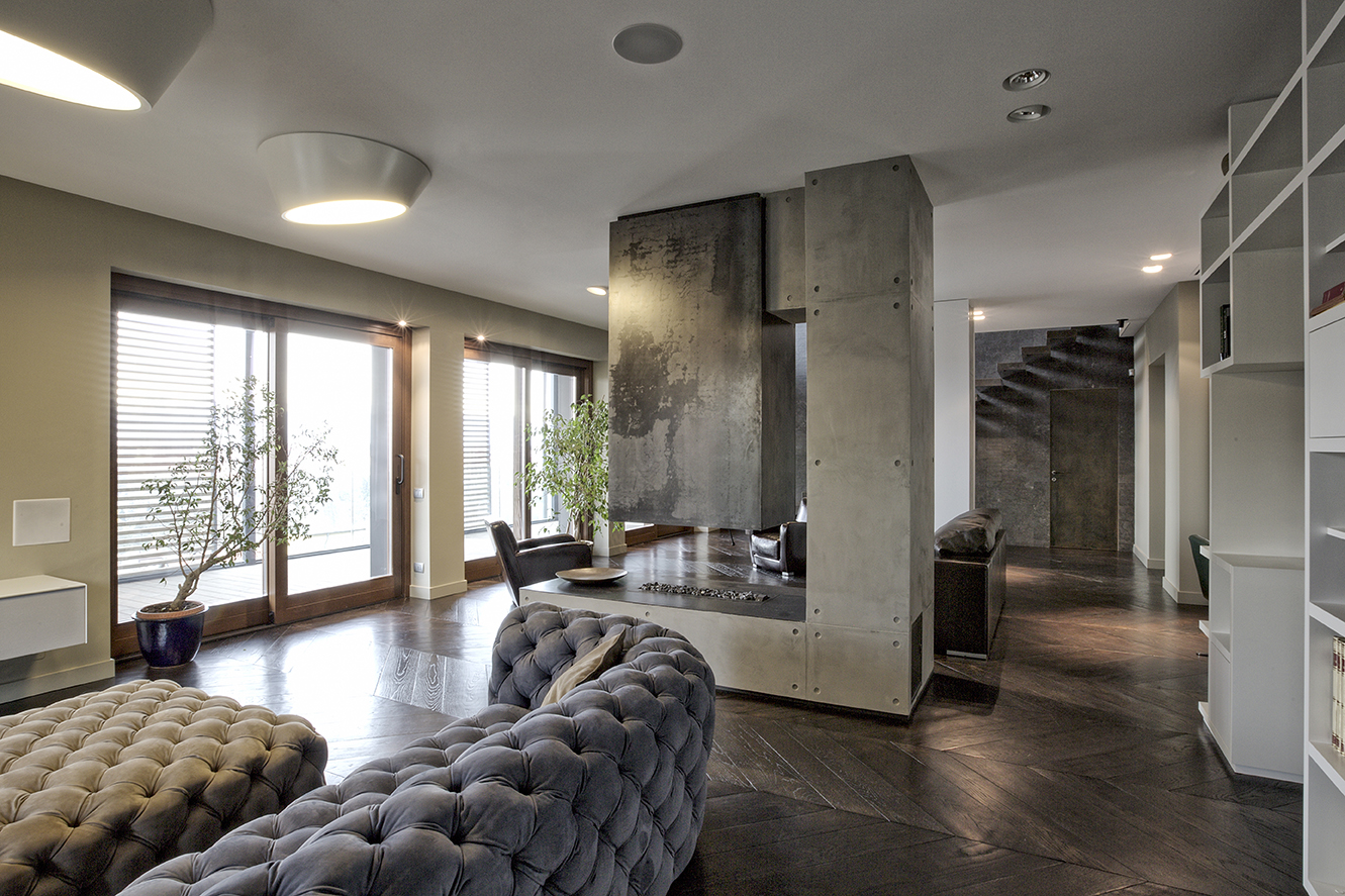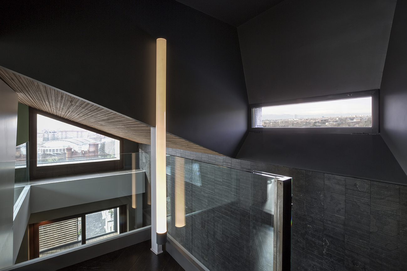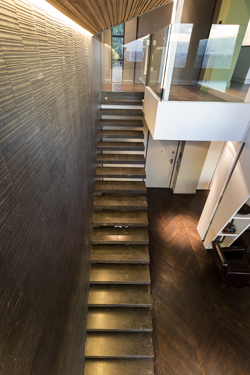 Il grande salone è un continuo di toni caldi e scuri: toni d’ombra, di lava, di notte, unificano le pareti, il pavimento in legno e il cuoio delle sedute ai due elementi architettonici che condensano lo spazio: il camino e la scala. Il camino centrale, in cemento a vista, si caratterizza per la cappa sospesa in acciaio nero ossidato; definisce un’area di relax e conversazione. Privata e introversa la zona notte si struttura ai lati del salone, in due nuclei separati e funzionalmente autonomi. L’accesso alle stanze da letto padronali si snoda attraverso corridoi attrezzati; pannelli tessili rivestono le armadiature. In questi brevi passaggi le fughe visive si rivolgono all’esterno, diventano coni ottici da cui ammirare la collina.