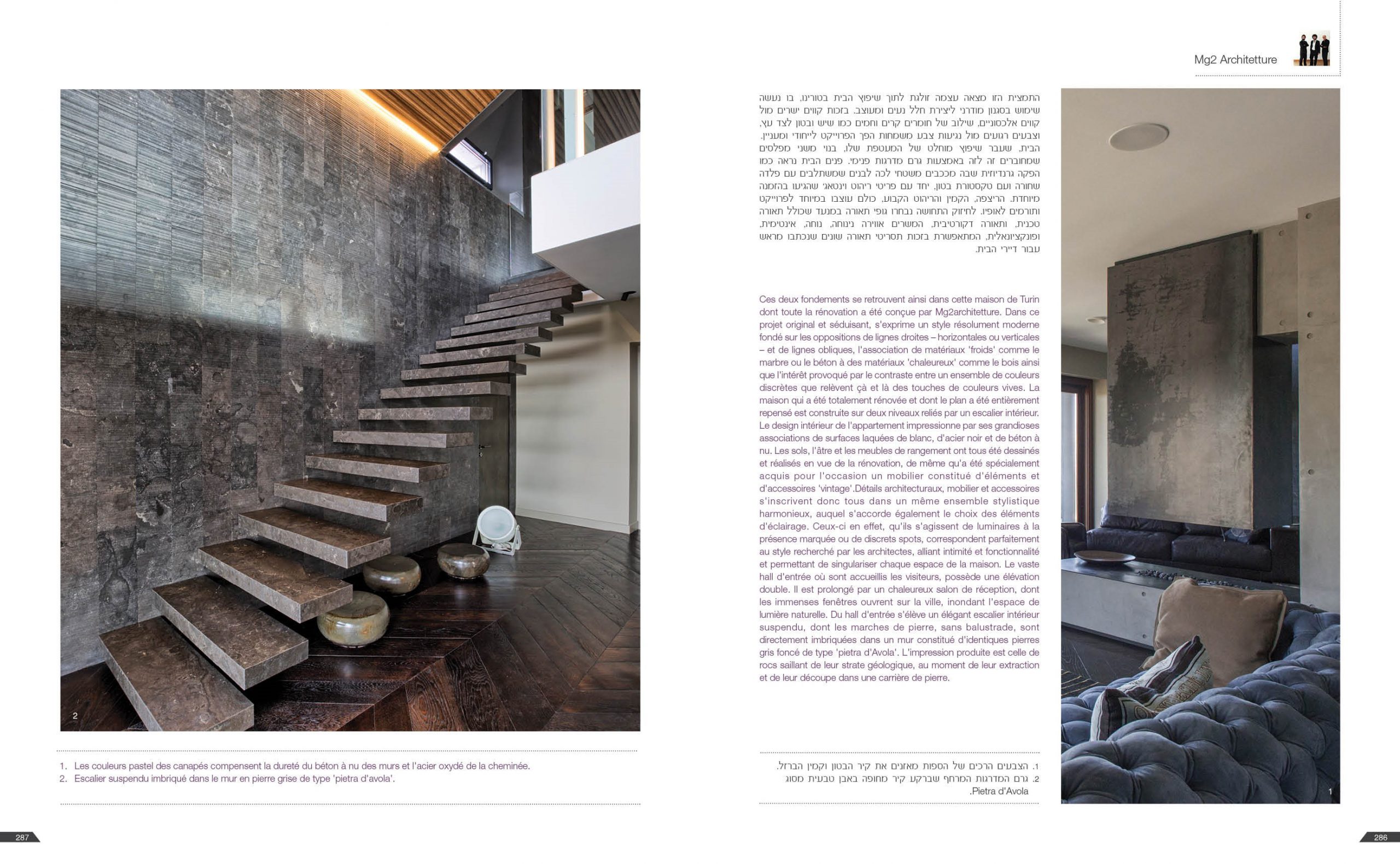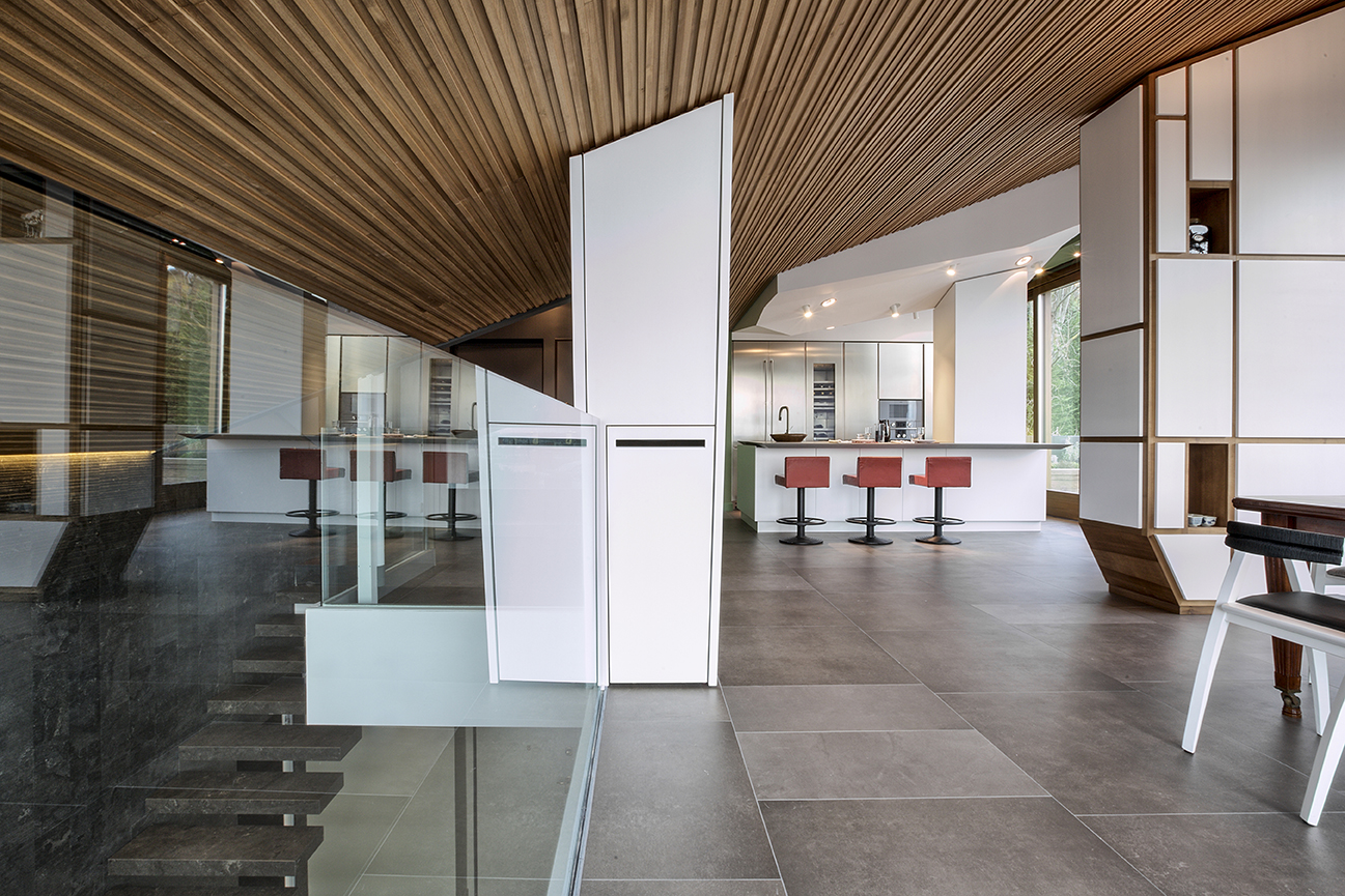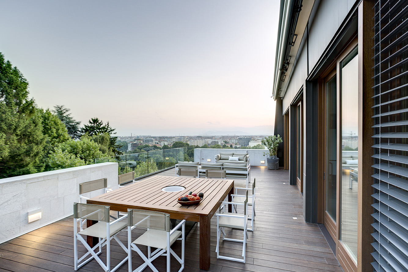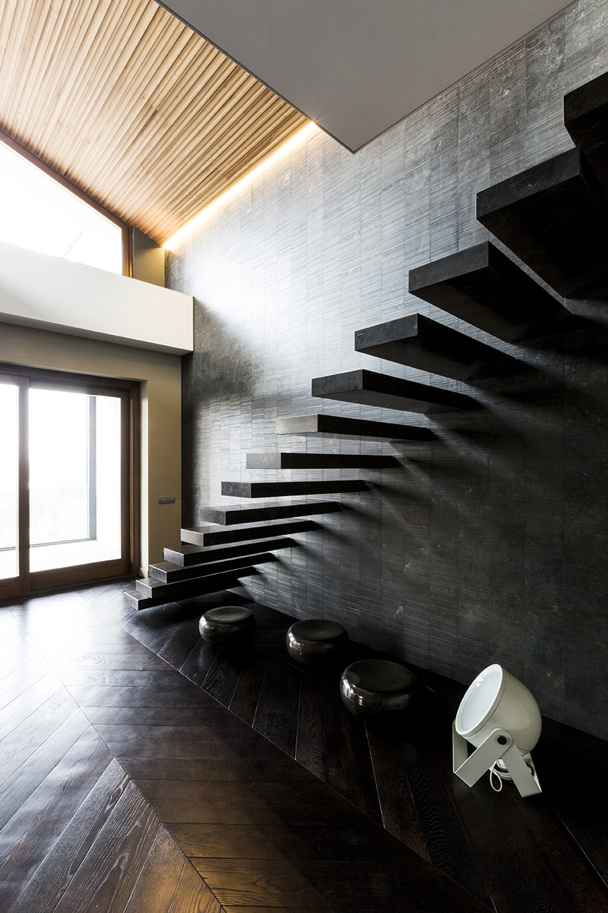 Il grande salone è un continuo di toni caldi e scuri: toni d’ombra, di lava, di notte, unificano le pareti, il pavimento in legno e il cuoio delle sedute ai due elementi architettonici che condensano lo spazio: il camino e la scala. Il camino centrale, in cemento a vista, si caratterizza per la cappa sospesa in acciaio nero ossidato; definisce un’area di relax e conversazione. Privata e introversa la zona notte si struttura ai lati del salone, in due nuclei separati e funzionalmente autonomi. L’accesso alle stanze da letto padronali si snoda attraverso corridoi attrezzati; pannelli tessili rivestono le armadiature. In questi brevi passaggi le fughe visive si rivolgono all’esterno, diventano coni ottici da cui ammirare la collina.