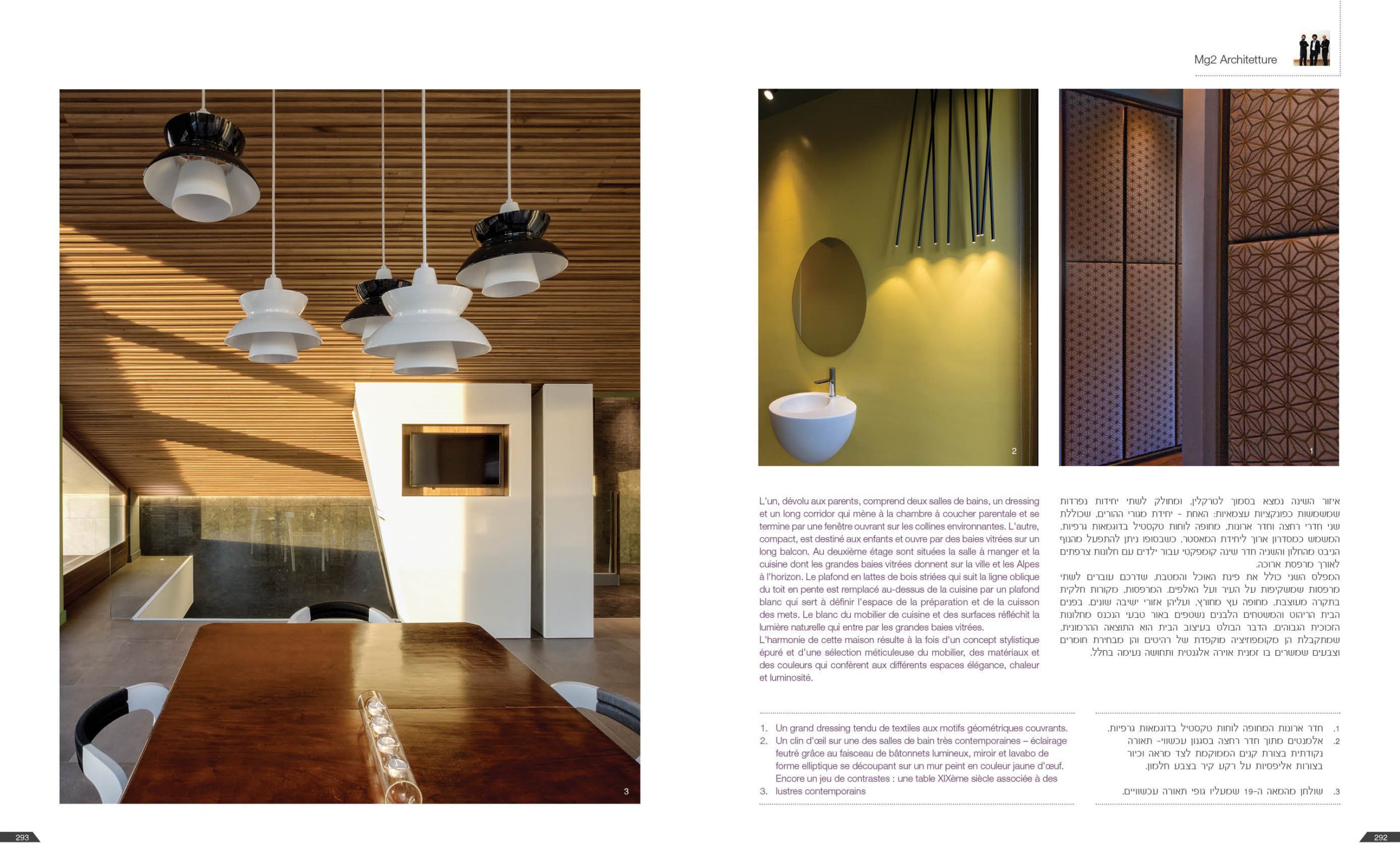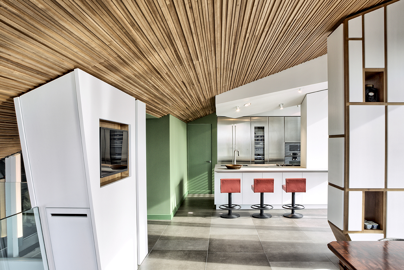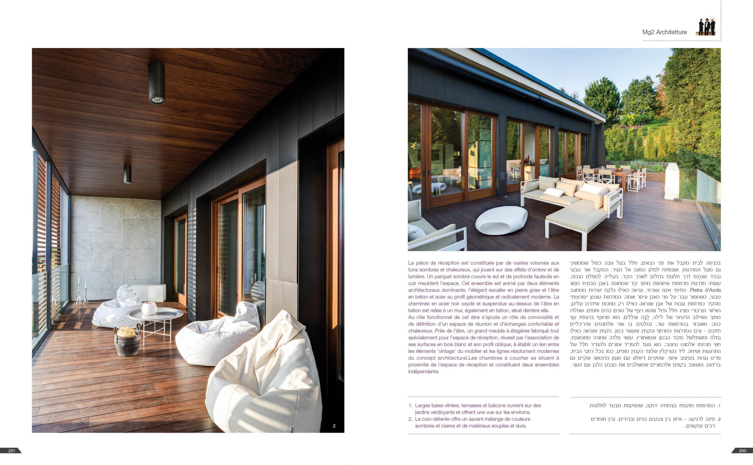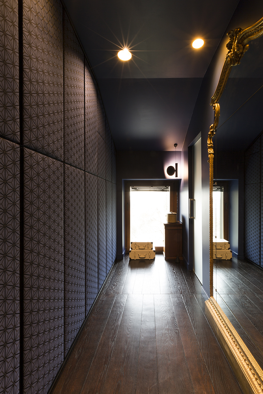 Il grande salone è un continuo di toni caldi e scuri: toni d’ombra, di lava, di notte, unificano le pareti, il pavimento in legno e il cuoio delle sedute ai due elementi architettonici che condensano lo spazio: il camino e la scala. Il camino centrale, in cemento a vista, si caratterizza per la cappa sospesa in acciaio nero ossidato; definisce un’area di relax e conversazione. Privata e introversa la zona notte si struttura ai lati del salone, in due nuclei separati e funzionalmente autonomi. L’accesso alle stanze da letto padronali si snoda attraverso corridoi attrezzati; pannelli tessili rivestono le armadiature. In questi brevi passaggi le fughe visive si rivolgono all’esterno, diventano coni ottici da cui ammirare la collina.