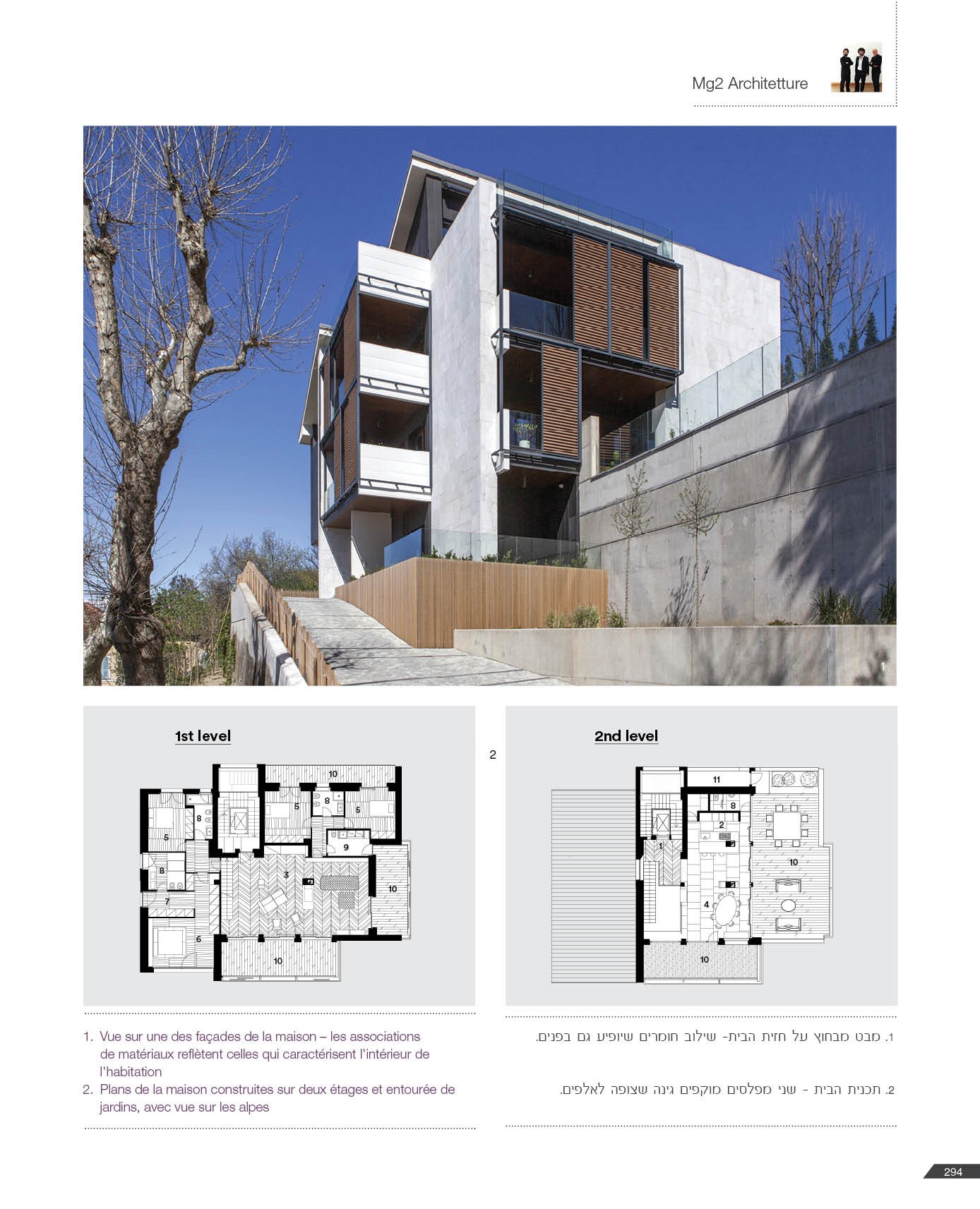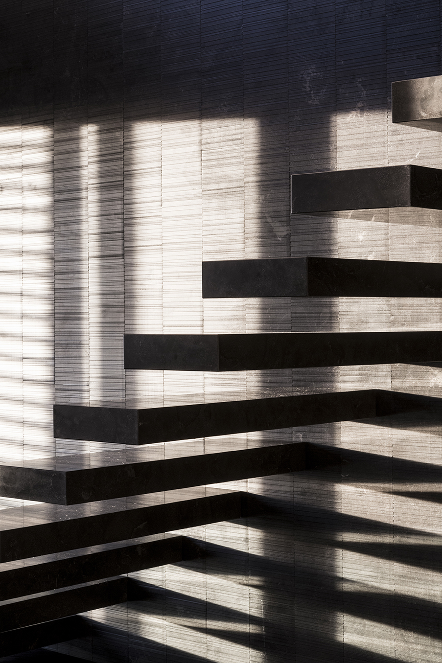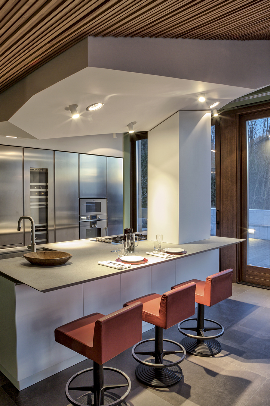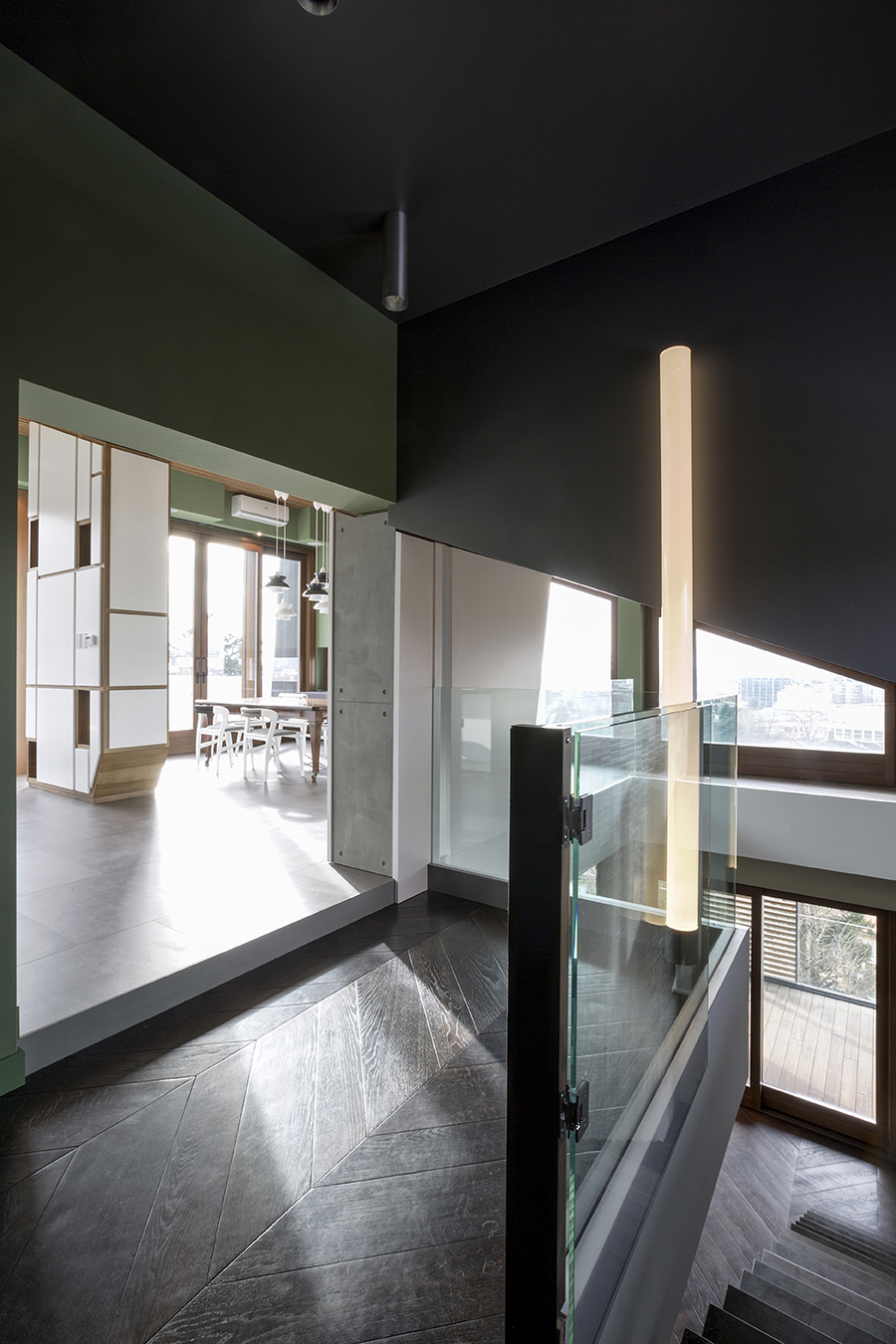 Il grande salone è un continuo di toni caldi e scuri: toni d’ombra, di lava, di notte, unificano le pareti, il pavimento in legno e il cuoio delle sedute ai due elementi architettonici che condensano lo spazio: il camino e la scala. Il camino centrale, in cemento a vista, si caratterizza per la cappa sospesa in acciaio nero ossidato; definisce un’area di relax e conversazione. Privata e introversa la zona notte si struttura ai lati del salone, in due nuclei separati e funzionalmente autonomi. L’accesso alle stanze da letto padronali si snoda attraverso corridoi attrezzati; pannelli tessili rivestono le armadiature. In questi brevi passaggi le fughe visive si rivolgono all’esterno, diventano coni ottici da cui ammirare la collina.