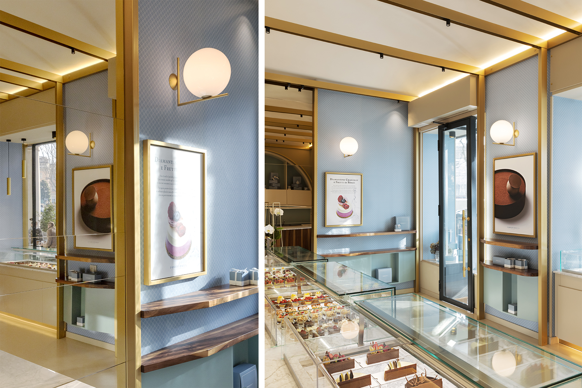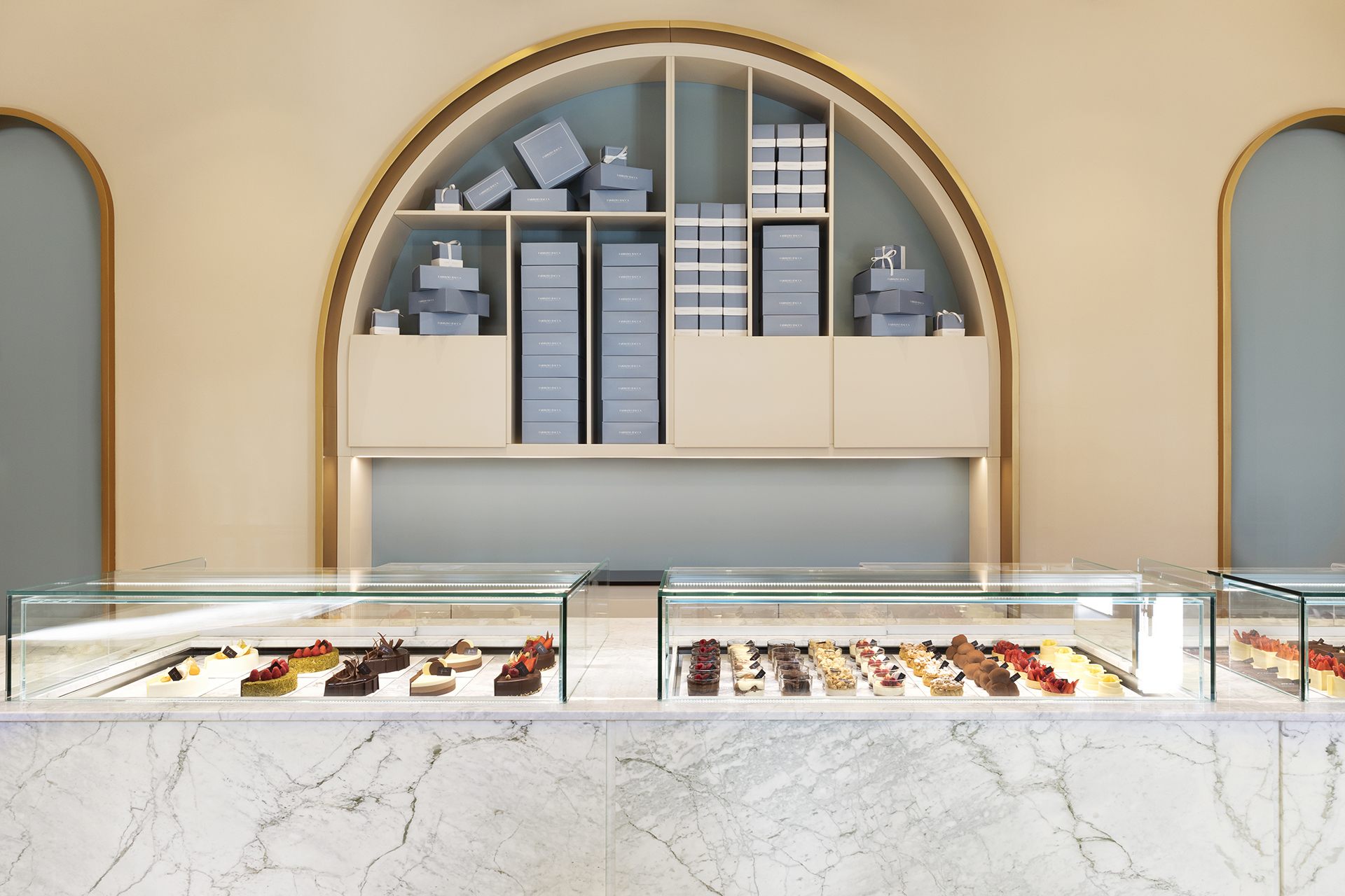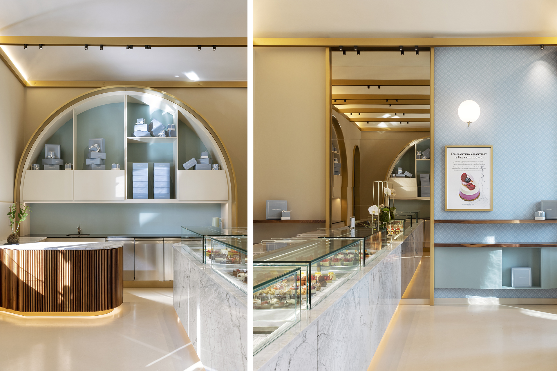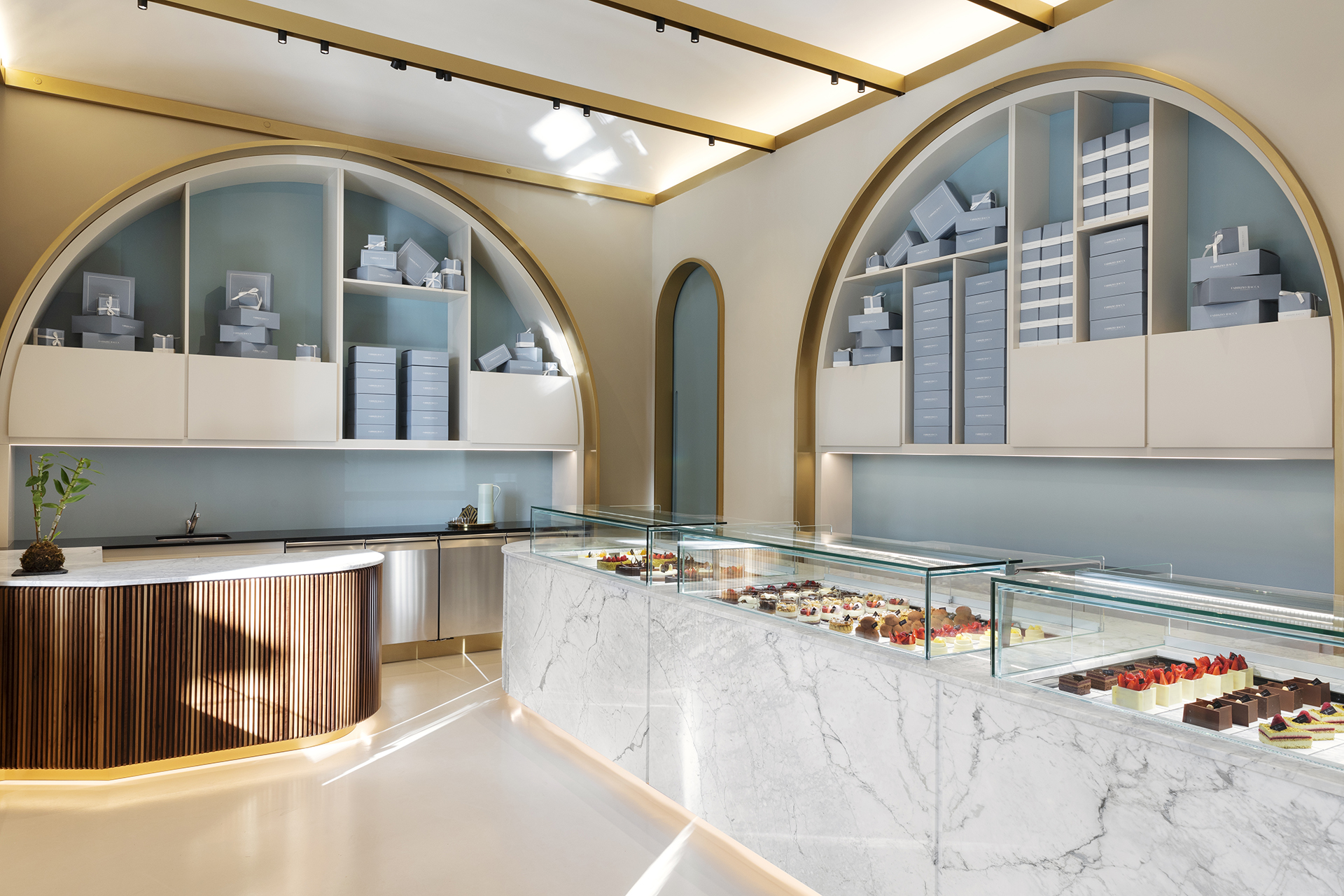 La scelta dei materiali e delle tonalità rispecchia l’immaginario della pasticceria: un pavimento in resina color crema si sposa perfettamente con i banconi e le superfici in marmo bianco di Carrara e legno di Noce Canaletto, con dettagli in bacchettato sulle parti curve. Il sistema di illuminazione riflette la luce sui dettagli in ottone dei grandi archi creando un equilibrio con il ton sur ton della texture delle pareti e delle superfici laccate.