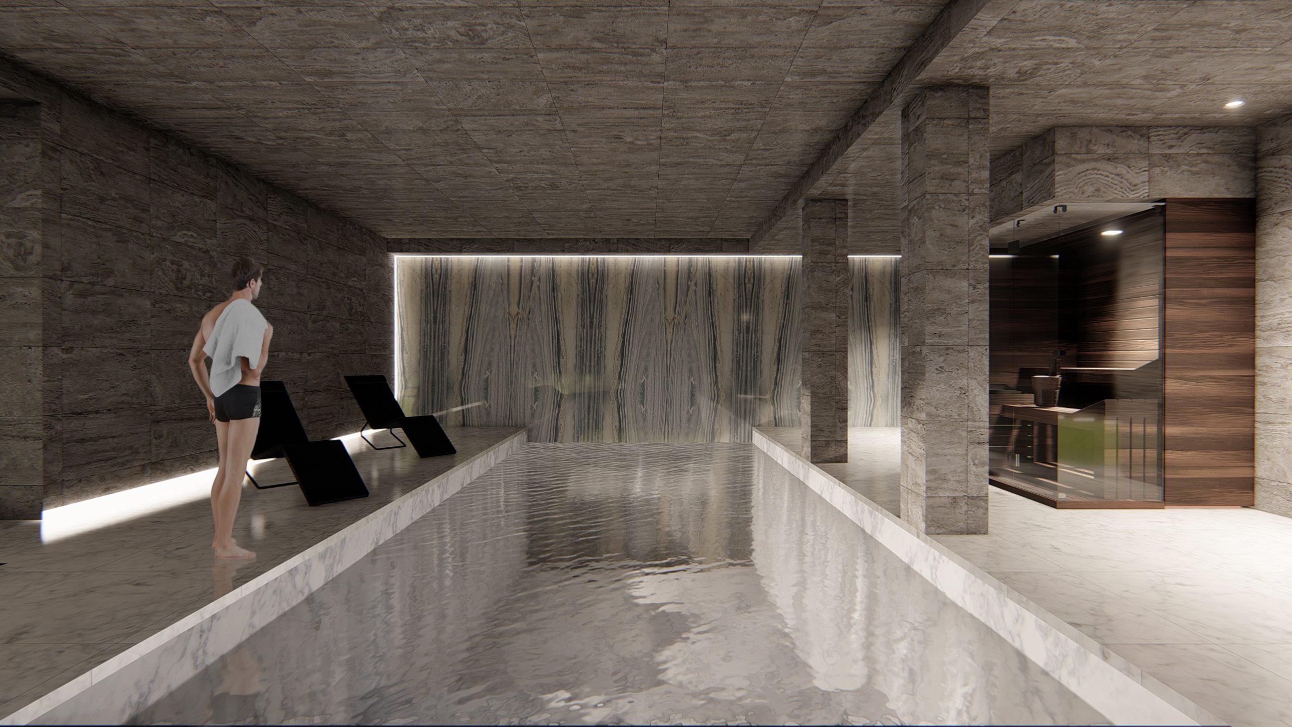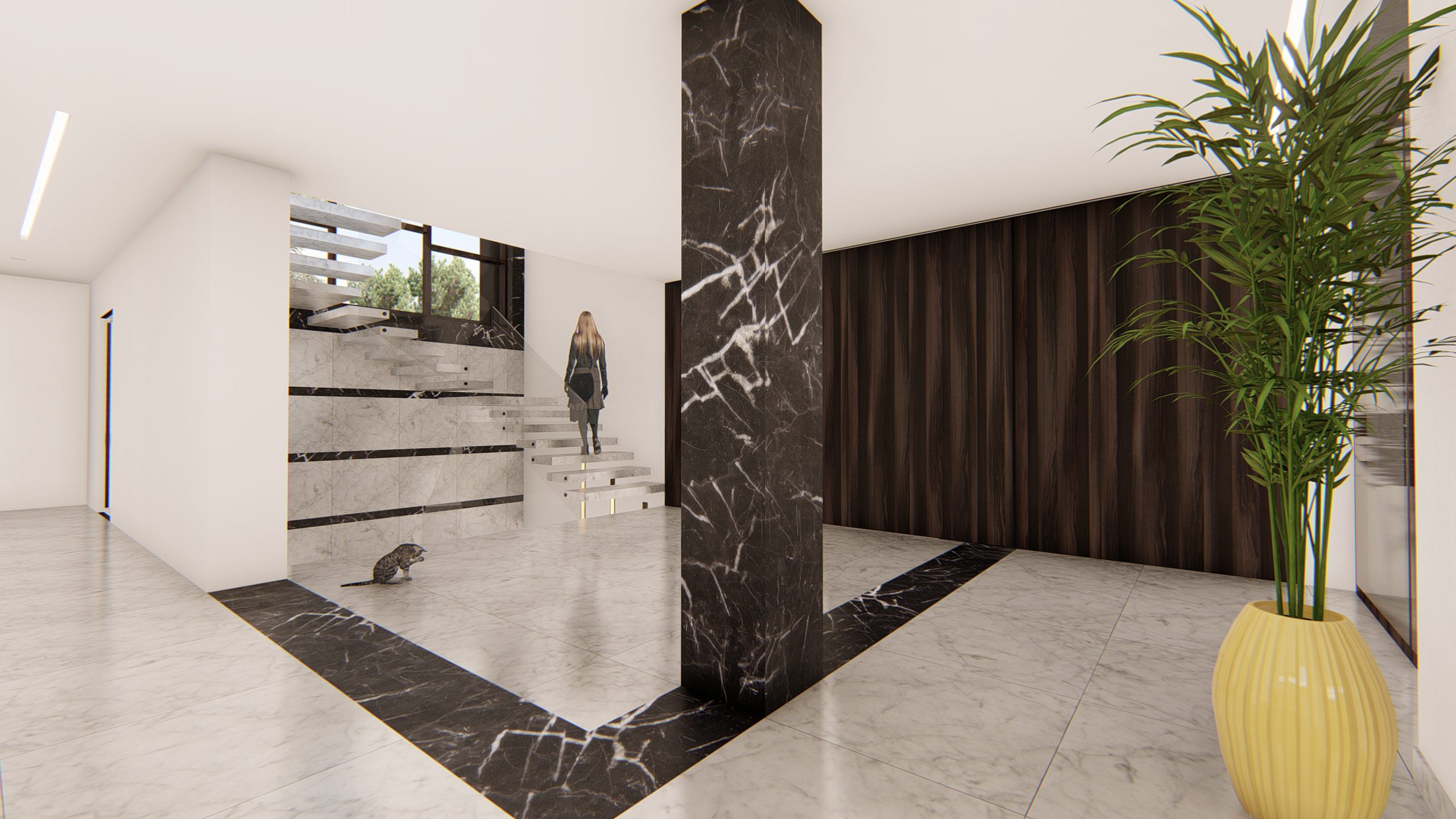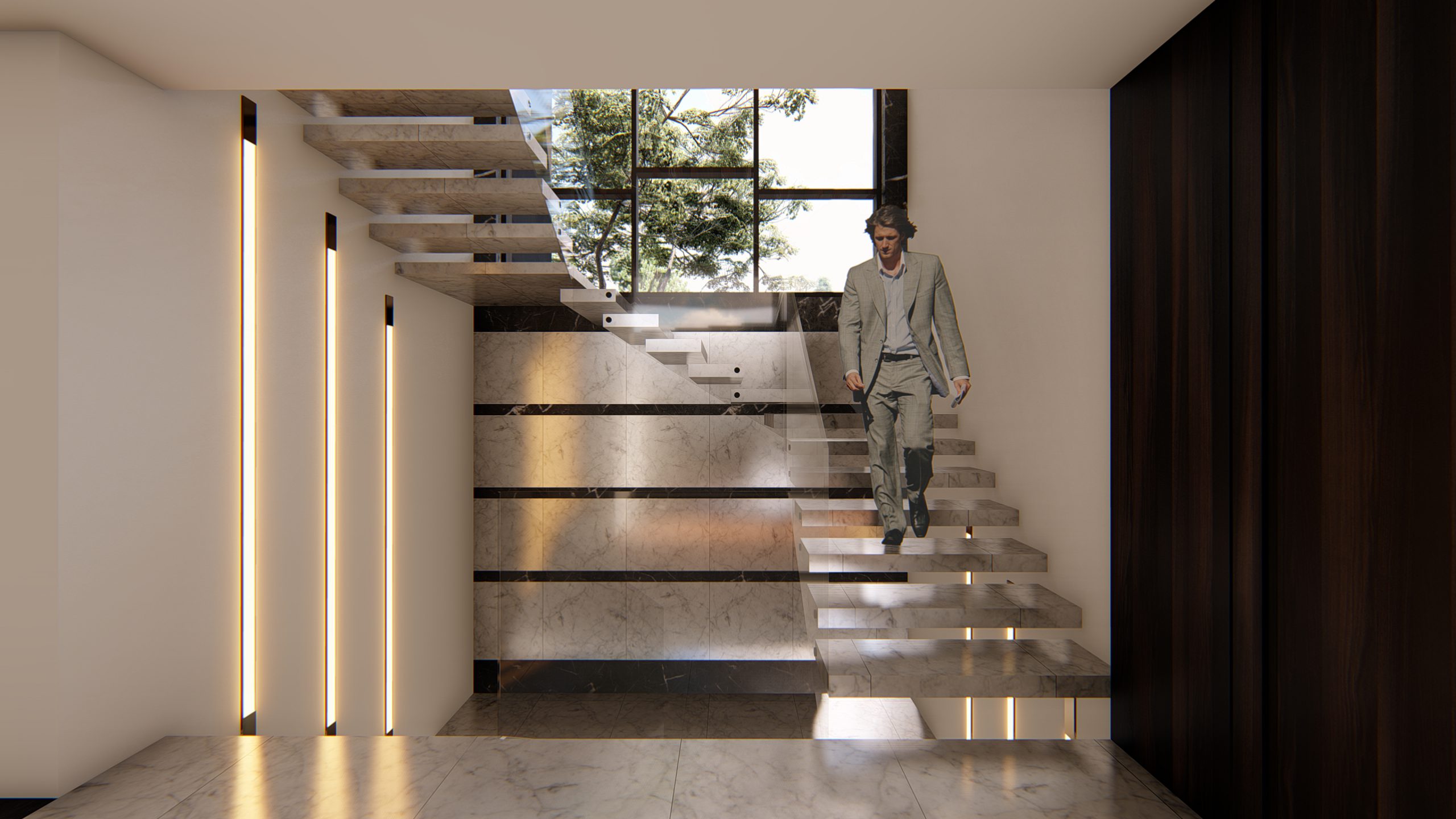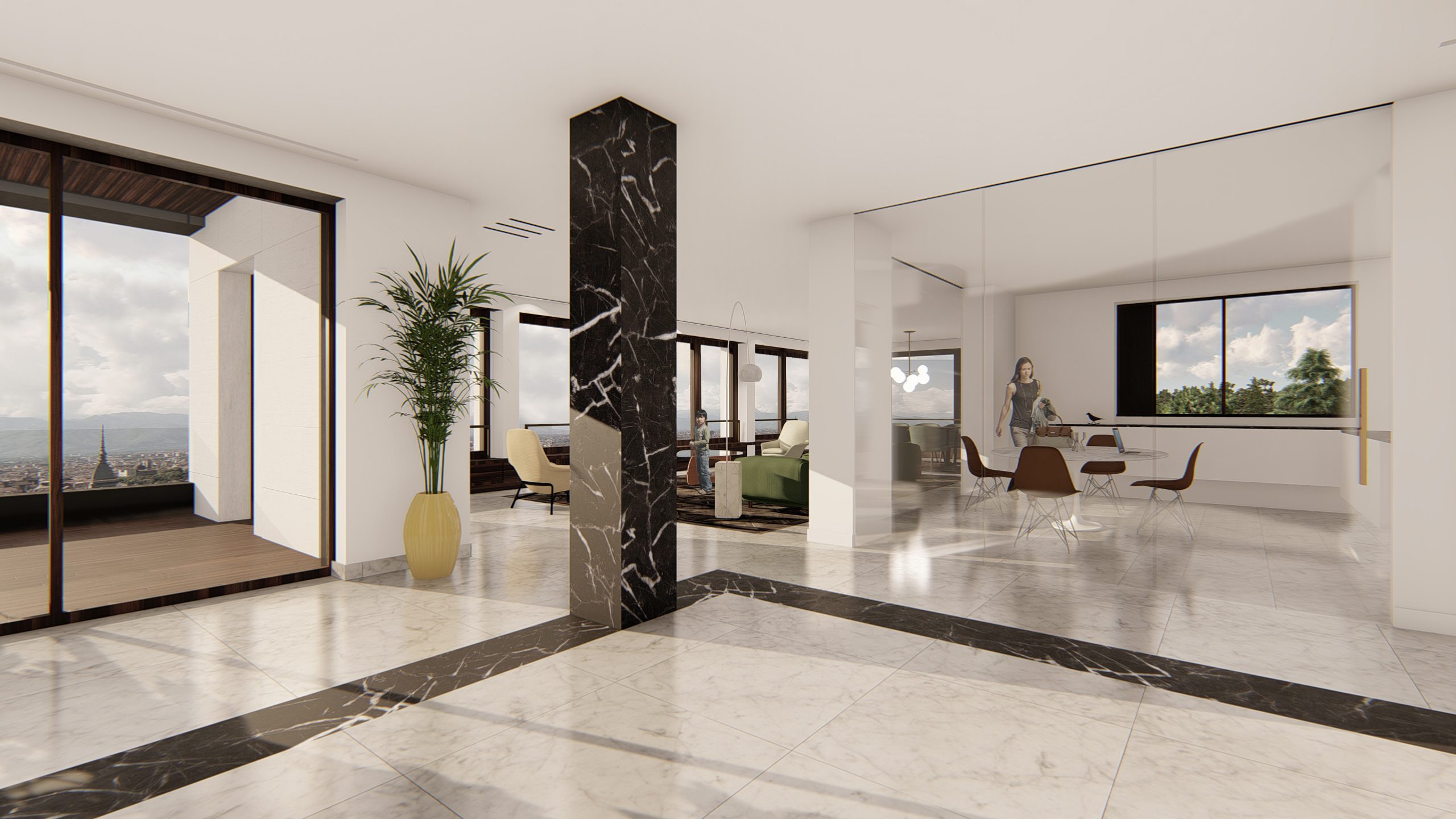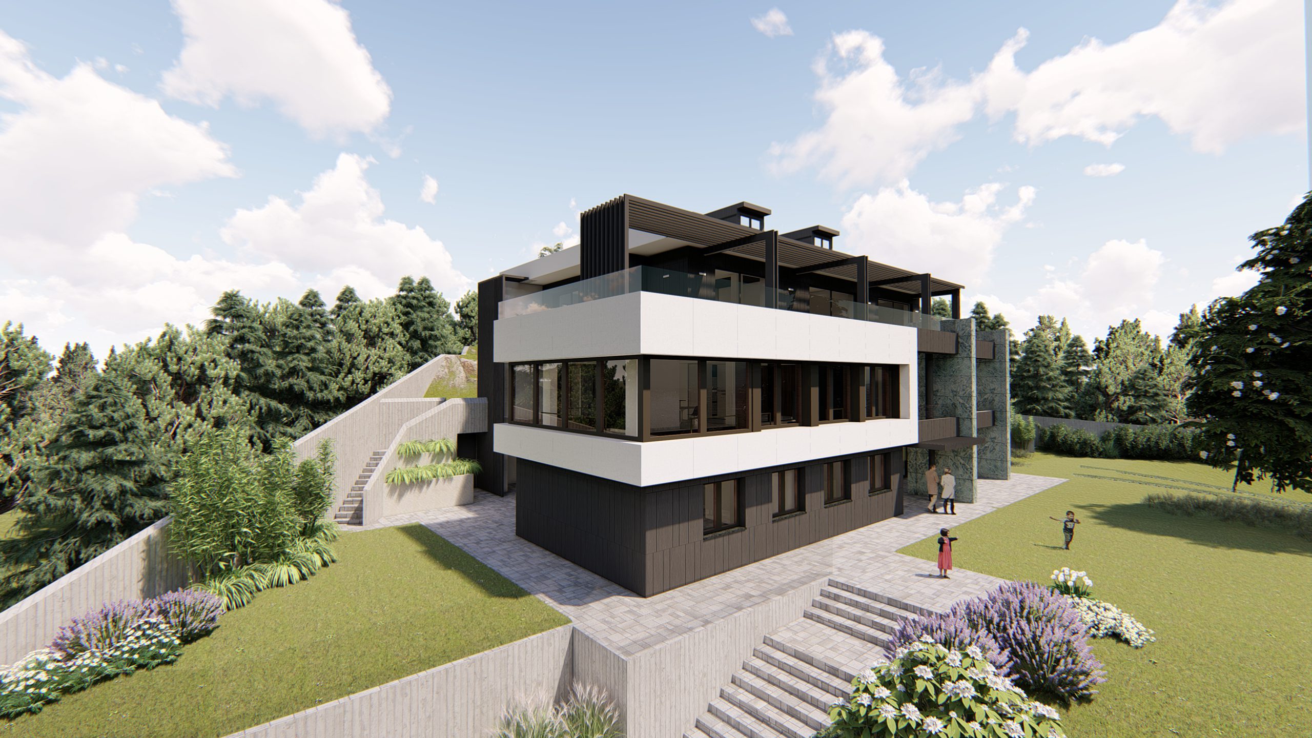 La vista è da cartolina! Dall’alto della sua posizione domina la città, l’intervento di restauro ha previsto la riplasmazione totale degli ambienti interni ed esterni creando al piano terra un appartamento di servizio, un monolocale per gli ospiti e una grande vasca d’acqua. La scala a sbalzo, rivestita in marmo, collega i vari piani. Al primo piano si trova l’ampio soggiorno, la cucina, lo studio, l’area lavanderia collegata con il giardino sul retro. Al secondo un ulteriore soggiorno separa la zona notte padronale da quella dei figli da dove si ha accesso al sottotetto, a loro dedicato. A lato della casa è stata realizzata, nel sottosuolo, un’autorimessa di 150 mq con l’ascensore che la collega fino al secondo piano della casa. Ad ogni piano sono presenti terrazzi dalla vista dominante sulla città. I rivestimenti delle facciate hanno giochi di chiaro/scuro e due setti in marmo verde, che connotano l’edificio.